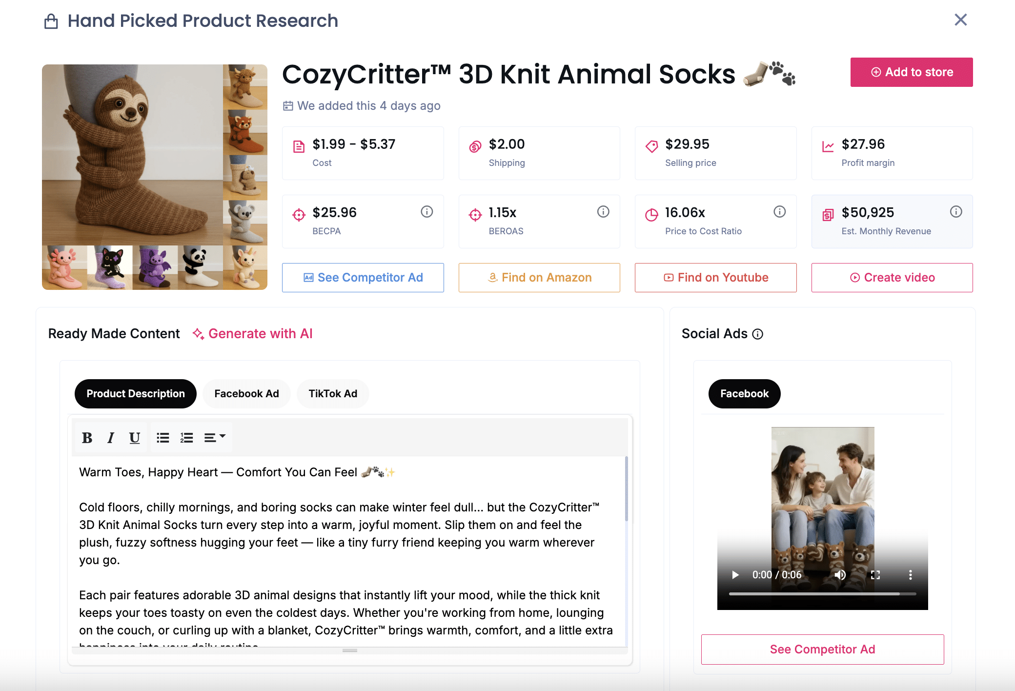 To take advantage of CozyCritter’s full potential, start with TikTok and Facebook ads that highlight the fun 3D animal designs. If you need help getting those up and running, our built-in video ad creator and Facebook audience builder can help you craft and launch your campaigns in minutes.