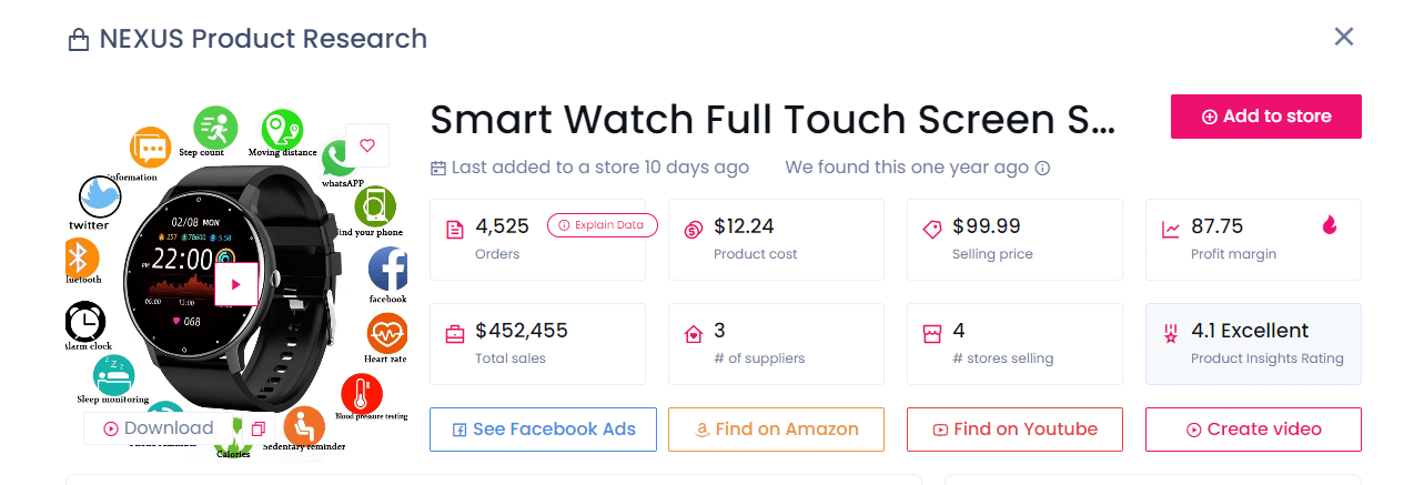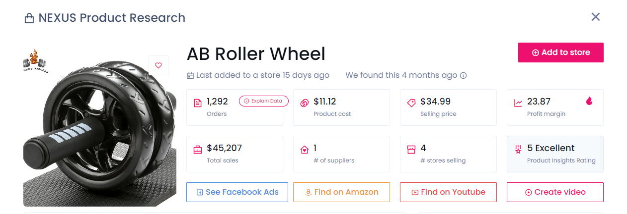 Por último, pero no menos importante, la rueda de rodillos Ab ha acumulado 1.292 pedidos y se vende en cuatro tiendas populares. Puedes comprarlo por 11,12 $ al proveedor y venderlo por 34,99 $, obteniendo un beneficio de 23,87 $ por unidad.