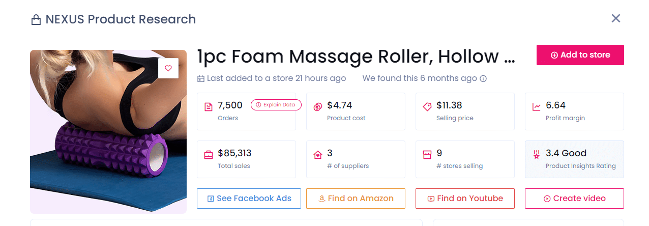 Con 7.500 pedidos y ventas en nueve tiendas populares, el Rodillo de Masaje de Espuma es un éxito rotundo. Puedes comprarlo por 4,74 $ al proveedor y venderlo por 11,38 $, obteniendo un beneficio de 6,64 $ por unidad.