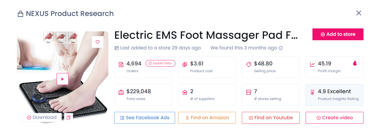 Para empezar, hablemos del Masajeador Eléctrico para Pies. Este producto ha sido un éxito, con 4.633 pedidos en los últimos tres meses en siete tiendas populares. Puedes comprarlo por 3,61 $ al proveedor y venderlo por 48,80 $, obteniendo un beneficio impresionante de 45,19 $ por unidad.
