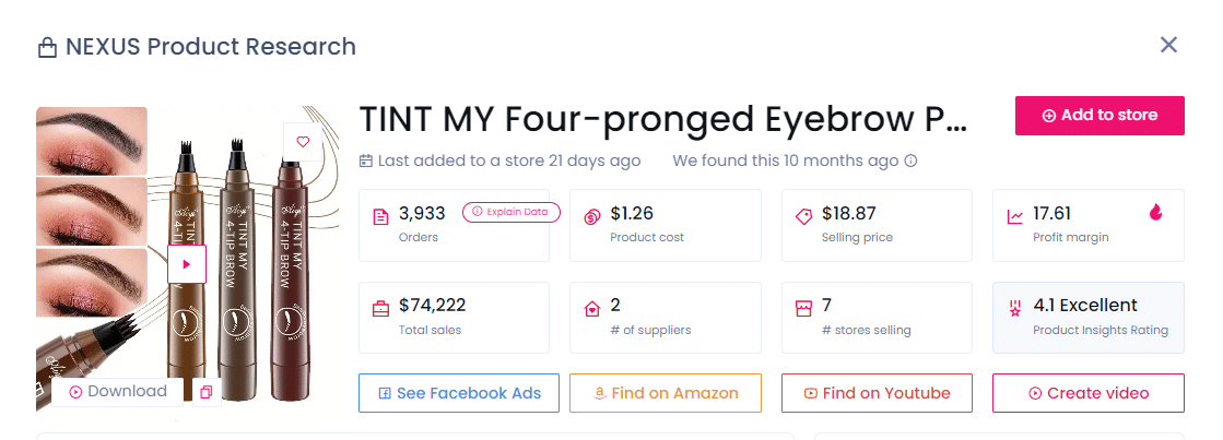 Le Crayon à sourcils a obtenu 3 933 commandes et 74 222 $ de ventes, et se vend dans sept magasins populaires. Vous pouvez l’acheter pour 1,26 $ auprès du fournisseur et le revendre à 18,87 $, réalisant un profit impressionnant de 17,61 $ par unité.