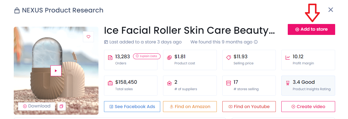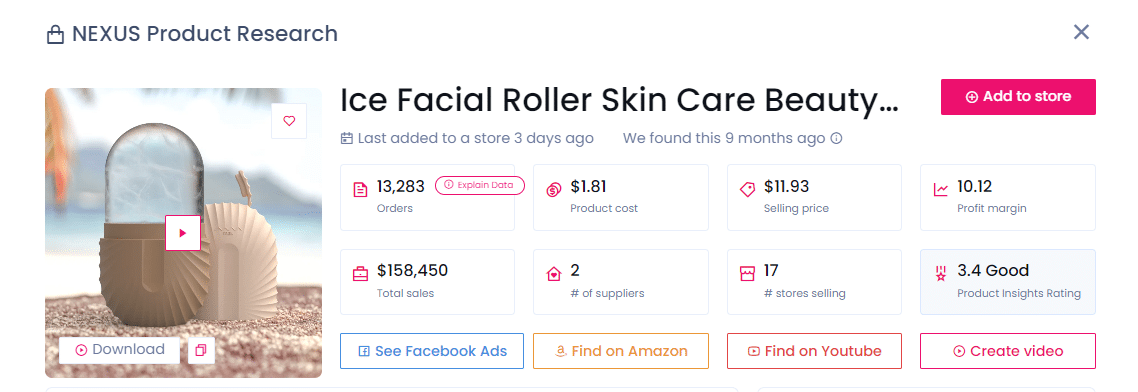 Commençons par parler du Ice Facial Roller. Ce produit a été une sensation, avec 13 283 commandes et 158 450 $ de ventes dans 17 magasins populaires. Vous pouvez l’acheter à 1,81 $ auprès du fournisseur et le revendre à 11,93 $, réalisant un remarquable bénéfice de 10,12 $ par unité.