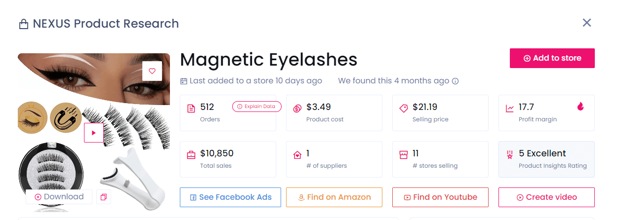 Ensuite, ce sont les cils magnétiques. Ce produit a enregistré 512 commandes et 10 850 $ de ventes au cours des dix derniers jours dans 11 magasins populaires. Vous pouvez l’acheter à 3,49 $ auprès du fournisseur et le revendre à 21,19 $, réalisant un profit impressionnant de 17,70 $ par unité.