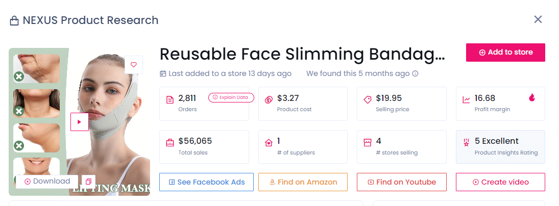 Enfin, le bandage minceur pour le visage a accumulé 2 811 commandes et 56 065 $ de ventes, et se vend déjà dans quatre magasins populaires. Vous pouvez l’acheter 3,27 $ auprès du fournisseur et le revendre à 19,95 $, réalisant un bénéfice substantiel de 16,68 $ par unité.