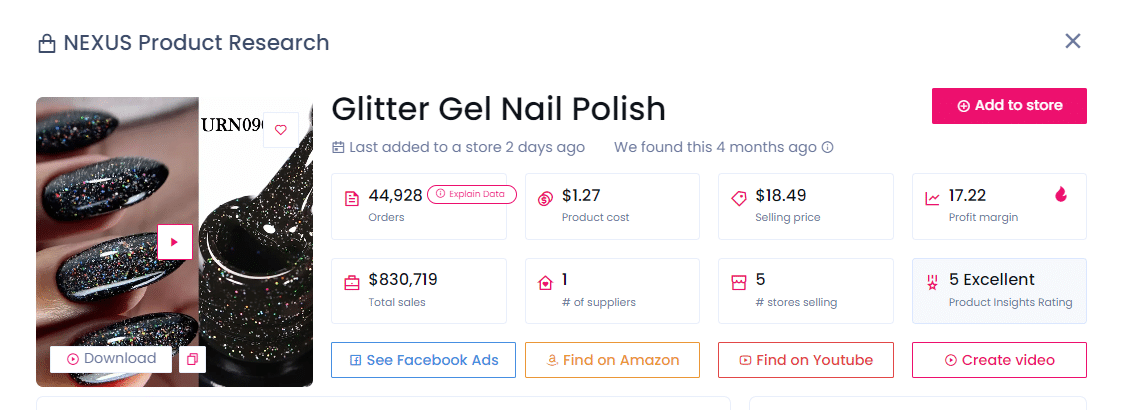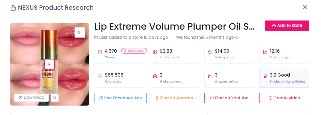Avec 4 370 commandes et 65 506 $ de ventes dans trois magasins populaires, Lip Oil est un vendeur très prisé. Vous pouvez l’acheter à 2,83 $ auprès du fournisseur et le revendre à 14,99 $, réalisant un bénéfice de 12,16 $ par unité.